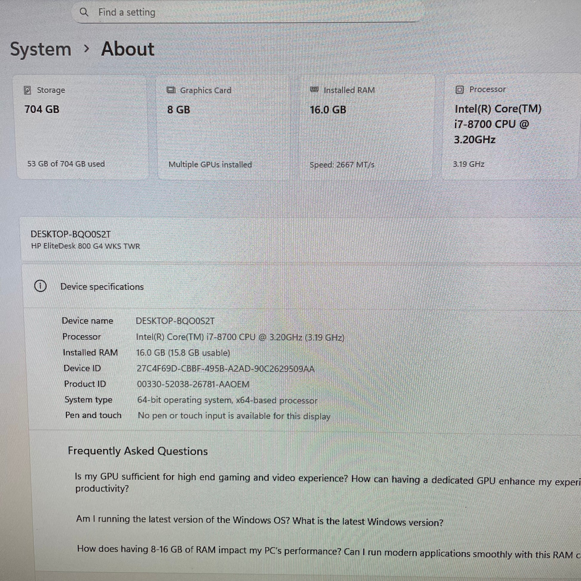 HP EliteDesk 800 G4 Tower Desktop PC, 16GB RAM, i7 8th Gen, 256GB SSD + 500GB HDD